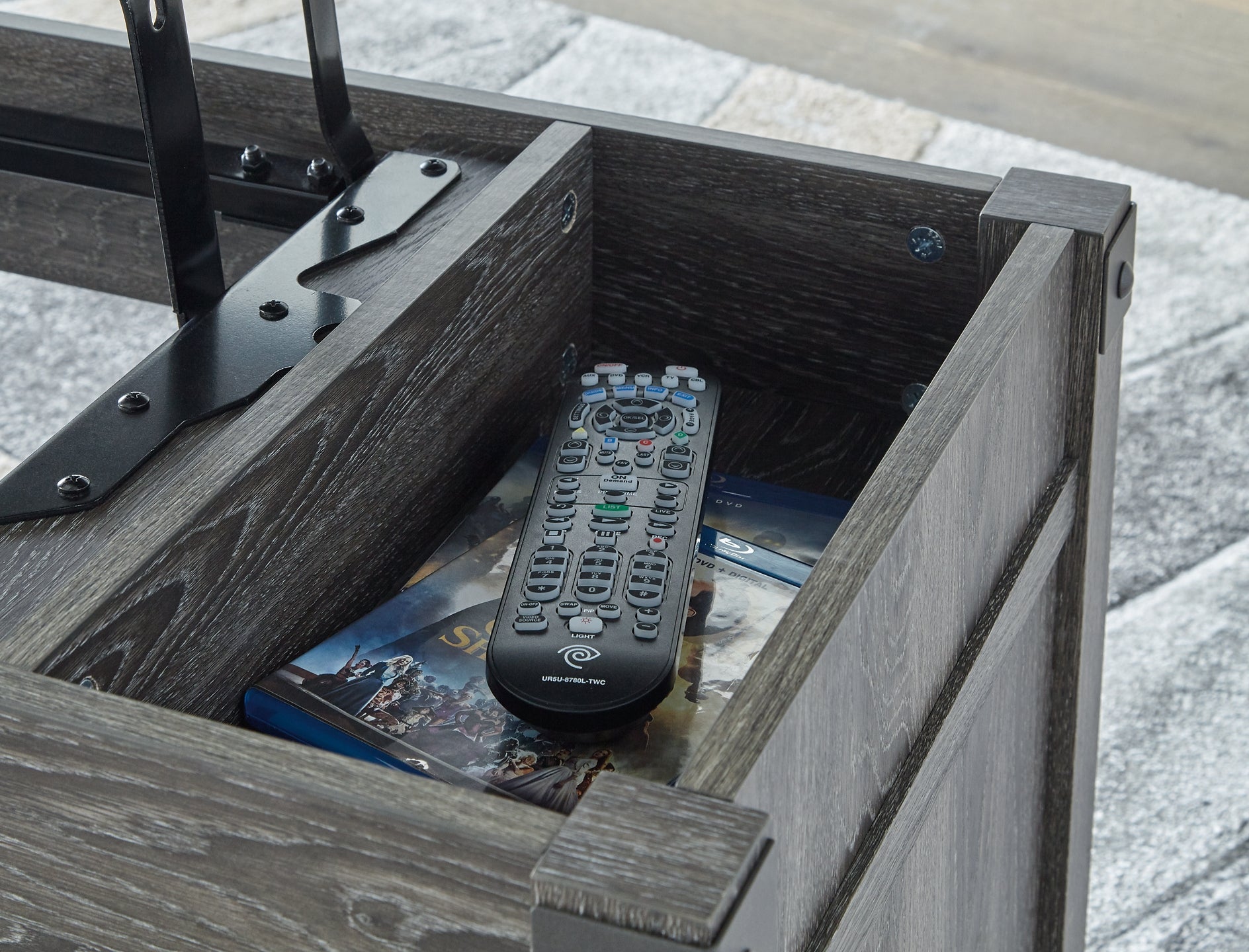 | Details | Made of metal and engineered wood, Gray decorative wood grain laminate, Metal crossbuck accents, Lift top design; hidden storage under lid, Fixed lower shelf, Assembly required | |