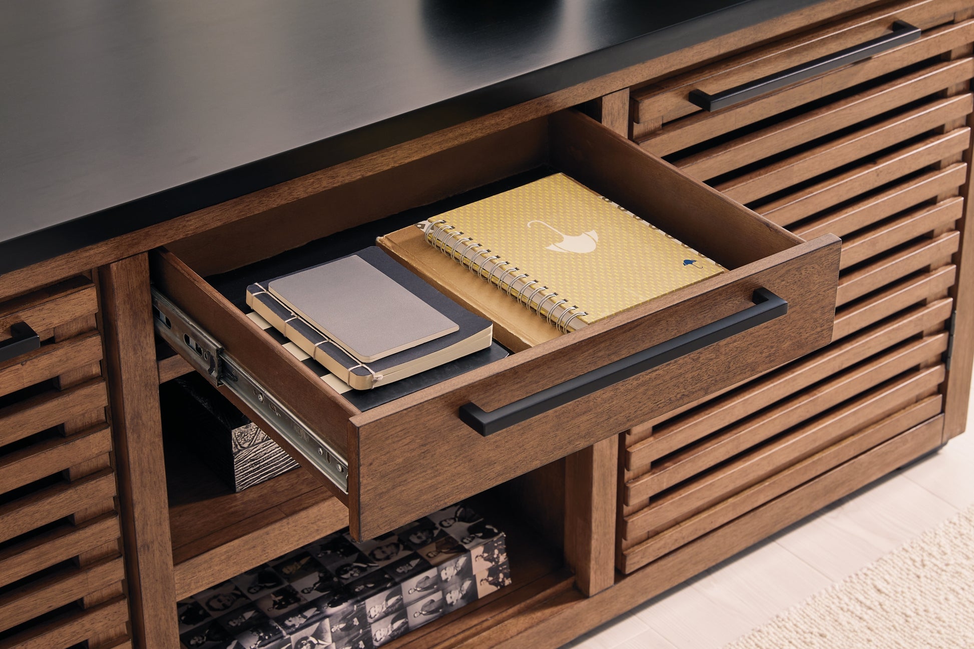 Double down on casual chic with the two-tone look of this credenza. With its warm brown and matte black finishes, it reflects your eye for modern design. The trend-right slatted styling on its doors brings added charm. And with the credenza's adjustable shelves, open storage and accessories drawer, keeping office essentials organized is a breeze.