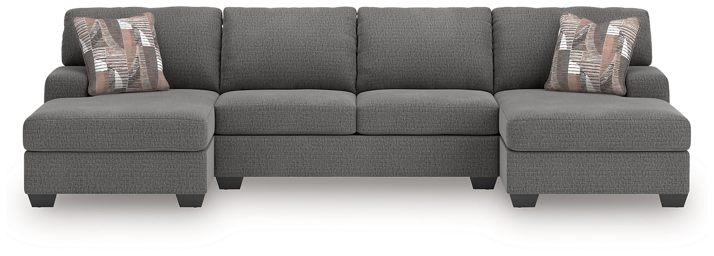 Details Includes 3 pieces: left-arm facing corner chaise, armless loveseat and right-arm facing corner chaise, "Left-arm" and "right-arm" describe the position of the arm when you face the piece , Corner-blocked frame , Attached back and loose seat cushions, High-quality foam cushions wrapped in poly fiber, Accent pillows included, Pillows with soft polyfill, Polyester upholstery, Exposed feet with faux wood finish  , Platform foundation system resists sagging 3x better than spring system after 20,000 testing cycles by providing more even support, Smooth platform foundation maintains tight, wrinkle-free look without dips or sags that can occur over time with sinuous spring foundations